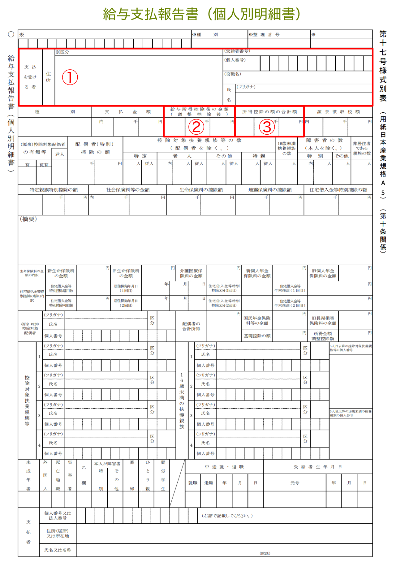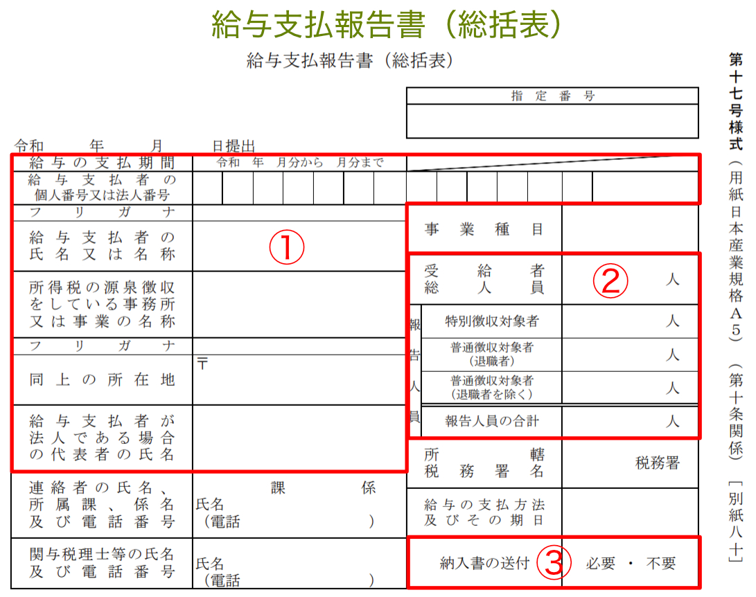 記載項目自体は多くありませんが、提出先や人数、納付方法に関わる情報が集約されています。特に所得控除の適用内容など、個人別明細書の正確な集計が求められるため、間違いのないよう記載しなければなりません。