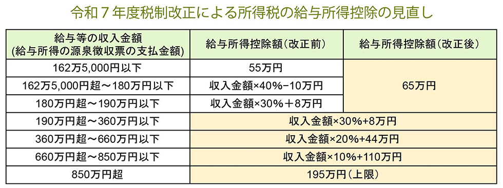 2025年度の税制改正により、基礎控除と給与所得控除が引き上げられ、給与所得者の税負担は全体的に軽減されます。基礎控除は最大95万円まで、給与所得控除は最大65万円まで引き上げられました。