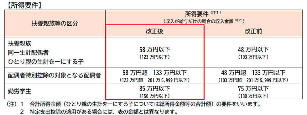 基礎控除の改正に伴い、扶養親族や配偶者に適用される所得基準がこれまでよりも緩やかになりました。