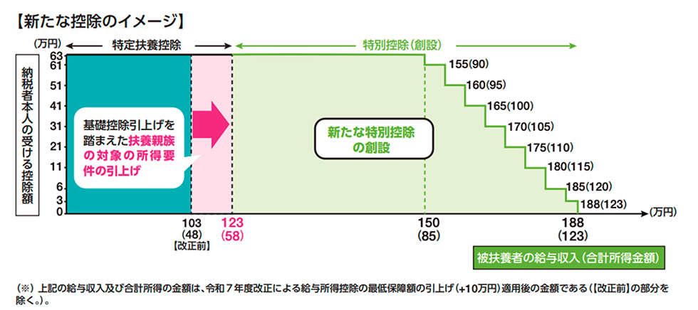 従来の「特定扶養控除」では、合計所得金額の上限が48万円から58万円に引き上げられています。さらに、新設された「特定親族特別控除」では、次の新たな仕組みが導入されました。