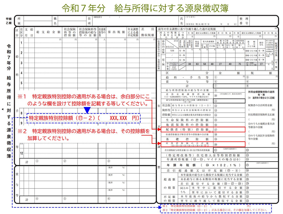 源泉徴収簿を使用している場合は、2025年(令和7年)分の様式には特定親族特別控除の欄が設けられていないため、控除額を余白部分などに記載します。