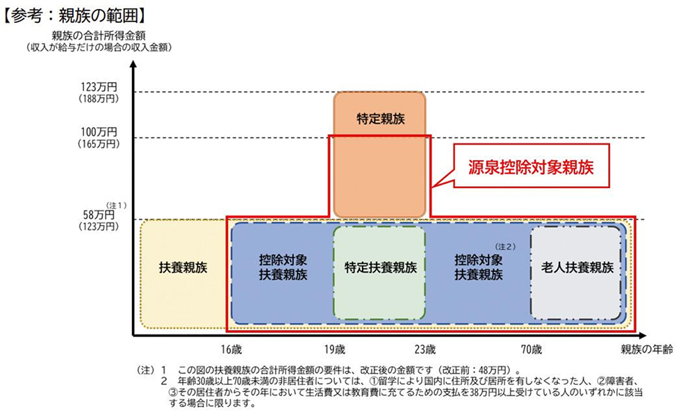 従来の扶養控除と比べ、所得要件が大きく緩和されています。所得税の適用開始は、2025年(令和7年)分からの適用です。