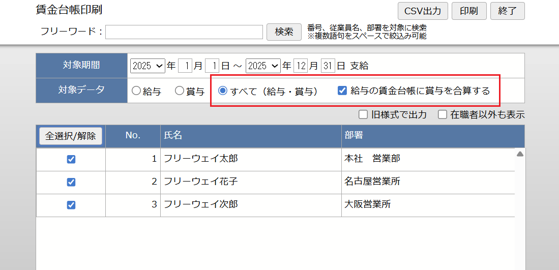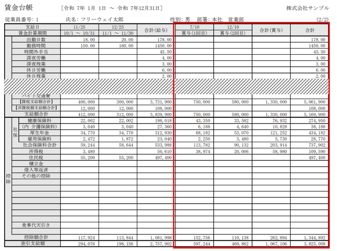 2.賃金台帳に、給与と賞与を合算して印字する機能を追加