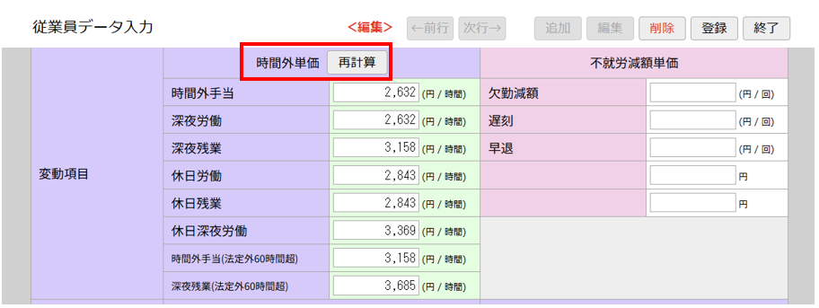 4.従業員データ入力画面に、時間外単価の再計算ボタンを新設